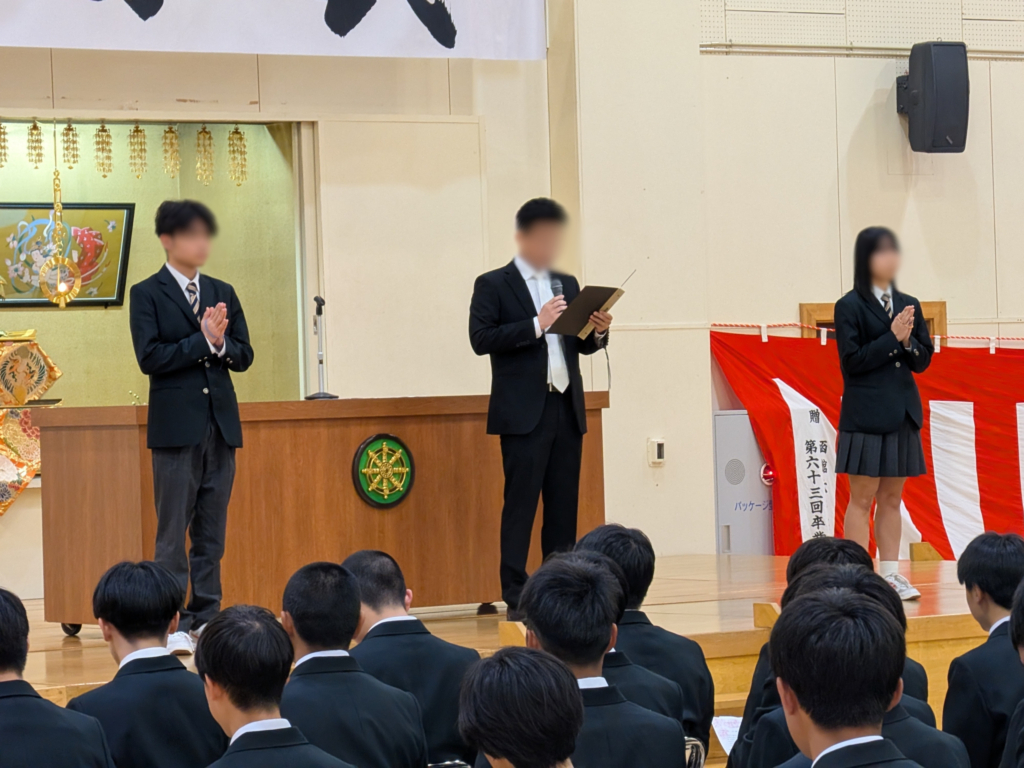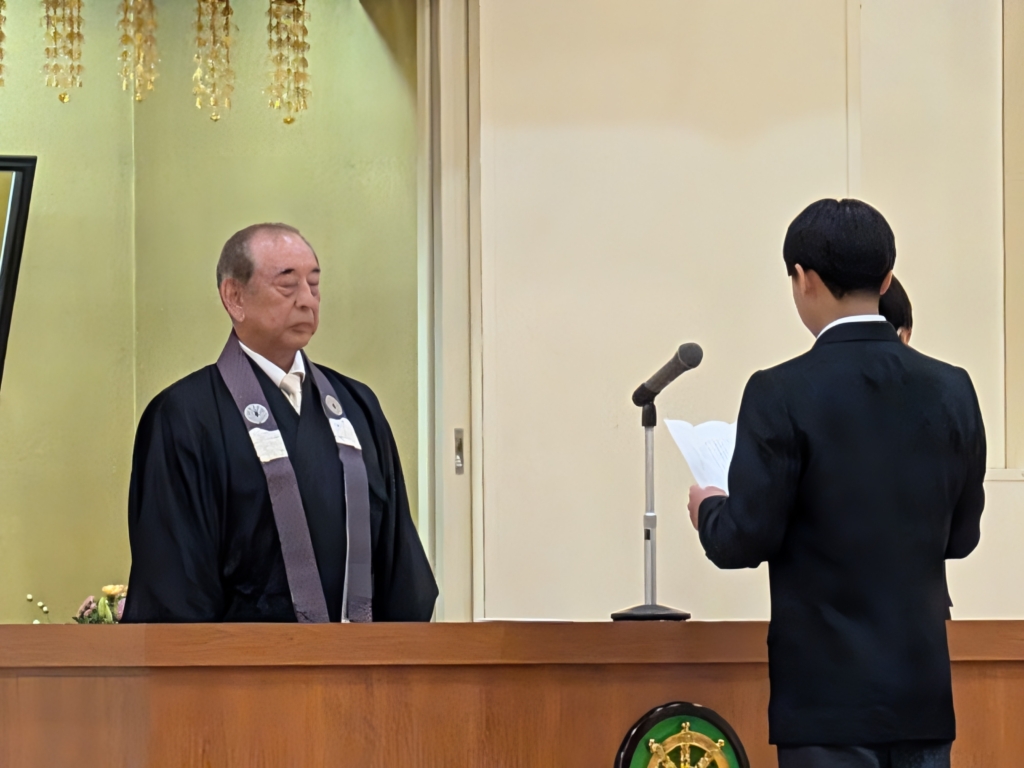 本校は真宗大谷派の教えを建学の精神としており、式典では「献灯献花」や「合掌」を行っています。